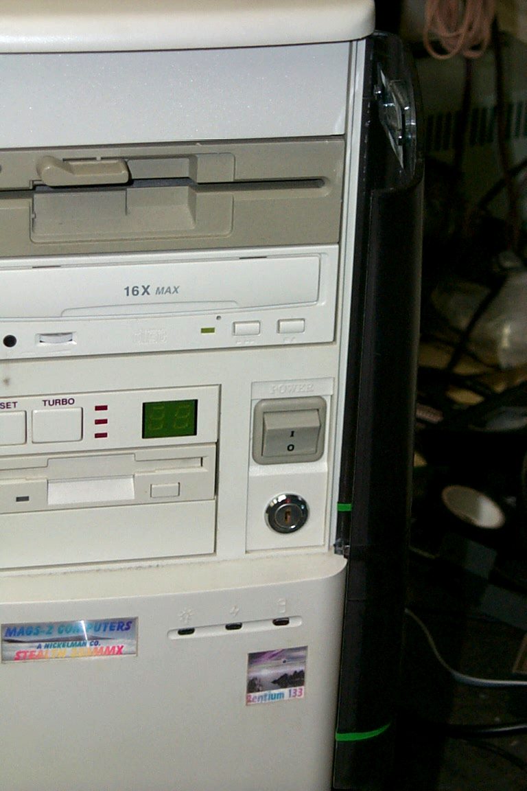 | Blaze's Computer Front The 16x CD ROM in here is also gone and he has a 52x High Value in it now. the 16x Goldstar here is still working but was older and would not recognize CD RW's and well that sucked. Also it was to slow to run new games. Now the computer is to slow to run new games period. That is why he will get my 600 and I have already got a buyer for this one =). Still a good computer for someone to use for their lil kids. Our next door neighbor is already buying it. Like the custom tags on here? LOL! Ooopss the Pentium 133 is in there. Hehhehee! The case used to house my Pentium 75 and 133 Intel MoBo with the lightning crappy speed of the Triton chipset. LOL! What a crappy MoBo that was I didn't even have the guts to sell it to anyone. It use to loss the slave drive on the 2nd channel IDE. It was there sometimes and sometimes Ooops not there. Windows 95 hated that board. 8 flash bios changes I had to make on that board. May itrest in Pieces ooopss peace. =) |